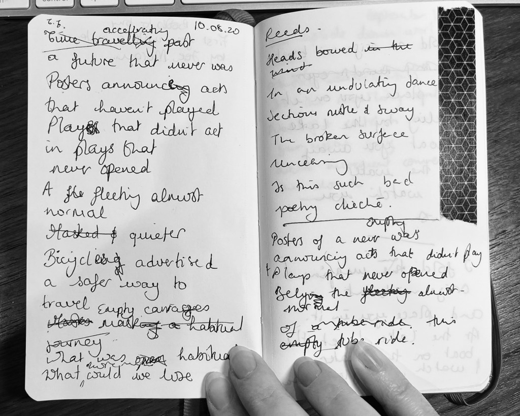 I’ve been tidying up a bit as I (re)launch into self-employed life, and I came across some poems I forgot that I wrote in 2020. As usual, there are versions of the same poem, longer and shorter, with scribbles and mis-spellings as they go from bad to – hopefully – better. Here is one that made me catch my breath. I think I wrote it on, or straight after, my first tube journey post lockdown one.